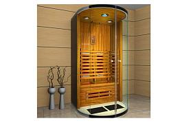 Изысканный классический дизайн — отличительная особенность сауны. Стекла в дверцах изготовлены из закаленного материала, внутри и снаружи имеются подсветка, встроенный FM/CD-плеер повышает функциональность модели.